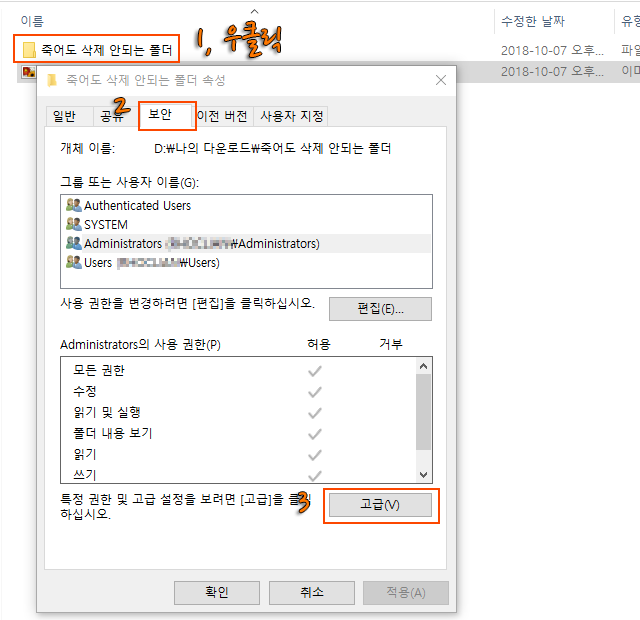 폴더 위에서 마우스 오른쪽 버튼을 누르고 속성 을 클릭합니다. 관리자 권한으로 삭제 마지막으로 다시 삭제할 폴더의 속성으로 들어가신다음. 윈도우10에서 폴더나 파일을 삭제하려고 하다 보면 관리자 권한을 요구하는 메시지와 함께 삭제가 되지 않는 경우가 있습니다.