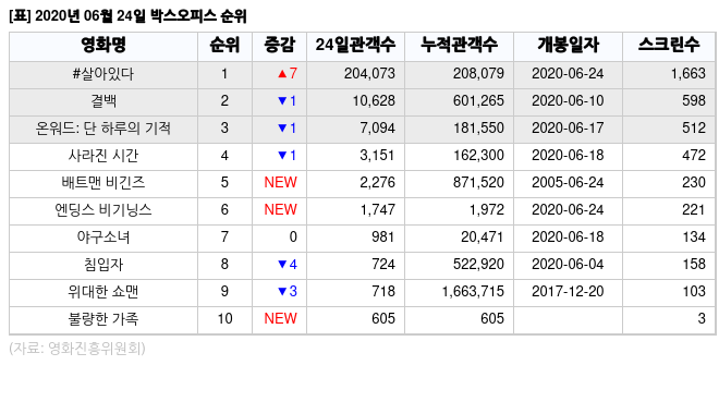 6월 24일 영화순위 1위 살아있다 2위 결백 3위 온워드 단 하루의 기적